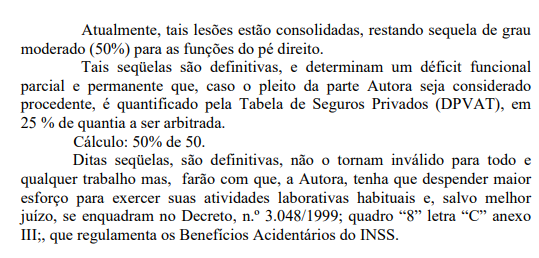 E a perícia judicial realizada em 30.01.2023 identificou que as lesões estão consolidadas, restando sequela de grau moderado (50%) para as funções do pé direito. Vejamos: