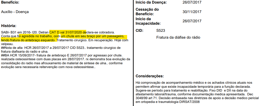Das perícias realizadas administrativamente (), verifica-se que, em 26/07/2017, a autora sofreu agressão física enquanto estava trabalhando como cobradora de ônibus, resultando em fratura no seu ante-braço: