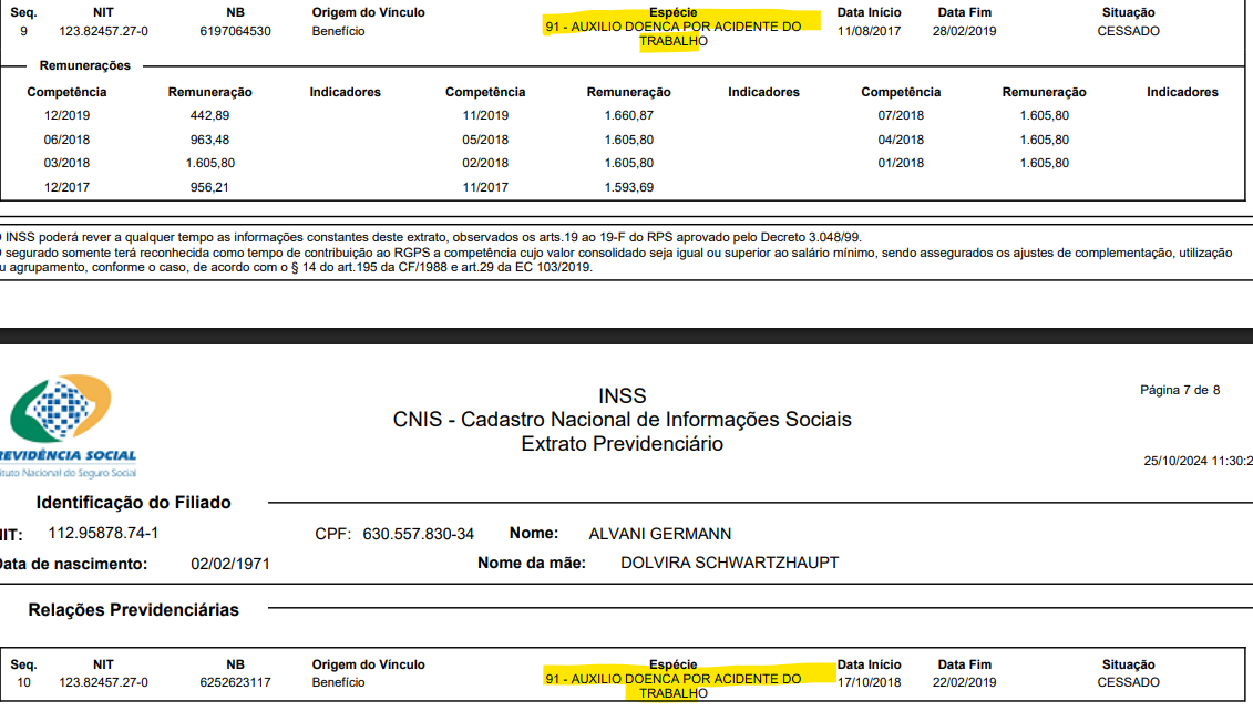 Em decorrência do acidente sofrido, o INSS deferiu a favor da autora dois benefícios por acidente de trabalho ():