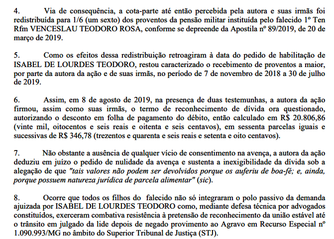 2.2. A documentação anexada aos autos demonstra que os pagamentos a maior realizados em prol da autora, pensionista de militar reformado, decorreram da habilitação tardia da Sra. ISABEL DE LOURDES TEODORO, que foi reconhecida como companheira de VENCESLAU TEODORO ROSA até o óbito dele, por meio da ação declaratória de união estável nº 0192046-46.2010.8.13.0707, que tramitou na Vara de Família de Varginha/MG.