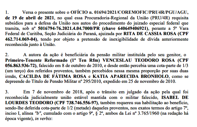 2.2. A documentação anexada aos autos demonstra que os pagamentos a maior realizados em prol da autora, pensionista de militar reformado, decorreram da habilitação tardia da Sra. ISABEL DE LOURDES TEODORO, que foi reconhecida como companheira de VENCESLAU TEODORO ROSA até o óbito dele, por meio da ação declaratória de união estável nº 0192046-46.2010.8.13.0707, que tramitou na Vara de Família de Varginha/MG.