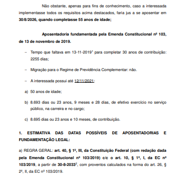 Na especie as informações constantes da Informação SELEG/SATS nº. 200/2021 (evento 1 - PROCADM6) mostram que a autora, na data da publicação da Emenda Constitucional nº 103, de 12.11.2019, ainda não reunia os requisitos para a concessão do benefício, contando então com 48 anos de idade (nascida aos 29/08/1971), verificando-se o seguinte quadro: