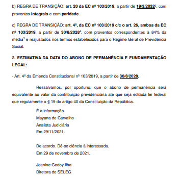 1.2 Ocorre que a EC nº 103/2019 promoveu a revogação das regras de transição estabelecidas pelas precedentes emendas à Constituição (EC nº 20/1998, EC nº 41/2003 e EC nº 47/2005), atingindo diretamente a situação jurídica da parte autora e fazendo com que sua data de aposentadoria com proventos integrais e paridade fosse protraída para o longínquo 19/03/2032 (Informação SELEG/SATS nº 200/2021, cópia anexa).