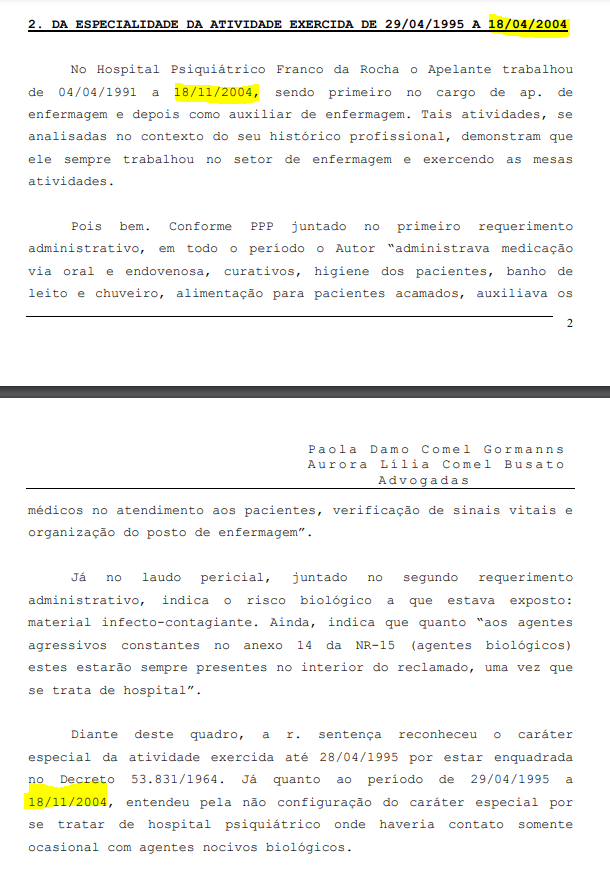 | Conclusão | É pacífica na jurisprudência a possibilidade do reconhecimento do exercício de atividade especial, antes do início da vigência da Lei 9.032/1995, pela presunção absoluta de nocividade quando esta estiver descrita nos Decreto 53.831/1964 e/ou Decreto 83.080/1979. Nesse trajeto, cumpre destacar que a atividade de enfermeiro estava prevista no quadro anexo ao Decreto 53.831/1964, item 2.1.3, e no anexo II, item 2.1.3, do Decreto 83.080/1979, o que permite o enquadramento como atividade especial até 28/04/1995. Ademais, a jurisprudência tem estendido aos técnicos de enfermagem, aos auxiliares de enfermagem e aos atendentes de enfermagem o direito à contagem diferenciada de tempo de contribuição por equiparação ao cargo de enfermeiro, a exemplo do seguinte julgado: (omissis) Assim, no caso em apreço, considerando que a autor trabalhou como auxiliar de enfermagem junto ao Hospital Franco da Rocha, o período de 04/04/1991 a 28/04/1995 pode ser reconhecido especial em razão do enquadramento da categoria profissional. Resta analisar o período subsequente, para o qual se exige a comprovação do caráter prejudicial da atividade, não sendo mais possível o enquadramento em categoria profissional. Na espécie, as atividades executadas pelo autor entre 29/05/1995 a 18/11/2004, enquanto auxiliar de enfermagem no hospital psiquiátrico, foram assim descritas no PPP: "Administrava medicação via oral e endovenosa, curativos, higiene dos pacientes, banho de leito e chuveiro, alimentação para pacientes acamados, auxiliava os médicos no atendimento aos pacientes, verificação de sinais vitais e organização do posto de enfermagem". No campo pertinente aos agentes nocivos, o documento informa a exposição a agentes tipo B, extraindo-se do conteúdo dos laudos que a referência está relacionada a agentes biológicos. Por se tratar de agentes biológicos, ainda que não se exija que a exposição ocorra de modo permanente durante toda a jornada de trabalho do segurado, deve restar demonstrada a configuração do efetivo e constante risco de contaminação e de prejuízo à saúde do trabalhador, o que ocorre justamente em razão do contato direto com pacientes acometidos de doenças infectocontagiosas ou com materiais de seu uso não esterilizados, conforme já ressaltado na fundamentação. Na hipótese, considerando a área de atuação e pacientes do hospital empregador, extrai-se que ainda que houvesse contato com agentes nocivos biológicos passíveis de causar prejuízos à saúde do segurado, este era meramente ocasional. Nesse sentido, aliás, o julgamento proferido pela Turma Recursal Suplementar do Paraná nos autos nº 5047523-66.2013.404.7000 e nº 5046886-18.2013.404.7000, em que também foi afastada a especialidade das atividades desenvolvidas em hospital psiquiátrico.Em conclusão, apenas o período de 04/04/1991 a 28/04/1995 deve ser computado como tempo especial, por enquadramento da categoria profissional. |