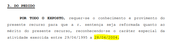 presente recurso para que a r. sentença seja reformada quanto ao mérito do presente recurso, reconhecendo-se o caráter especial da atividade exercida entre 29/04/1995 a 28/04/2004.