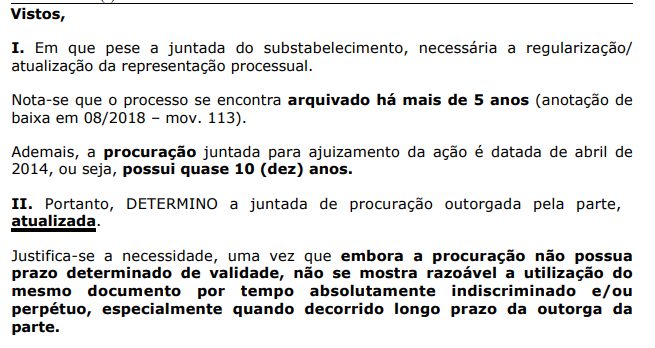 AGRAVO DE INSTRUMENTO. PREVIDENCIÁRIO. PROCURAÇÃO ATUALIZADA. DESNECESSIDADE. 1. Embora a antiguidade da procuração não invalide, em princípio, a representação processual, tampouco a capacidade postulatória do advogado, a exigência de nova procuração tem cabimento em situações excepcionais que justifiquem a cautela, como o grande lapso de tempo decorrido no curso do processo sem atuação do advogado, o número de autores e circunstâncias e peculiaridades do caso concreto que evidenciem a possibilidade de que o mandato já não subsista. 2. No caso, a excepcionalidade não se faz presente, uma vez que entre a outorga da procuração e a decisão agravada transcorreram três anos e não foi apontada qualquer circunstância em desabono à conduta da procuradora, que desde o início do processo esteve atuando como legítima representante da parte autora e de forma diligente. (TRF4, AG 5013652-15.2021.4.04.0000, DÉCIMA TURMA, Relator LUIZ FERNANDO WOWK PENTEADO, juntado aos autos em 11/11/2021)