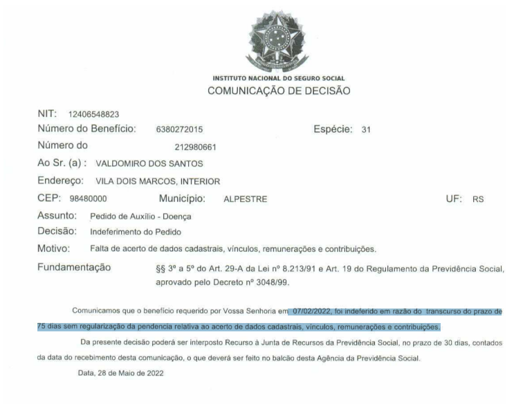 No caso dos autos, o benefício foi indeferido por ter a autarquia previdenciária considerado que “em razão do transcurso do prazo de 75 dias sem regularização da pendência relativa ao acerto de dados cadastrais, vínculos, remunerações e contribuições”