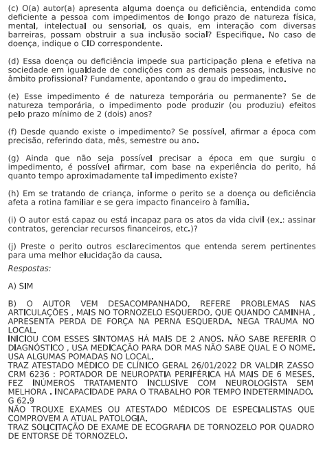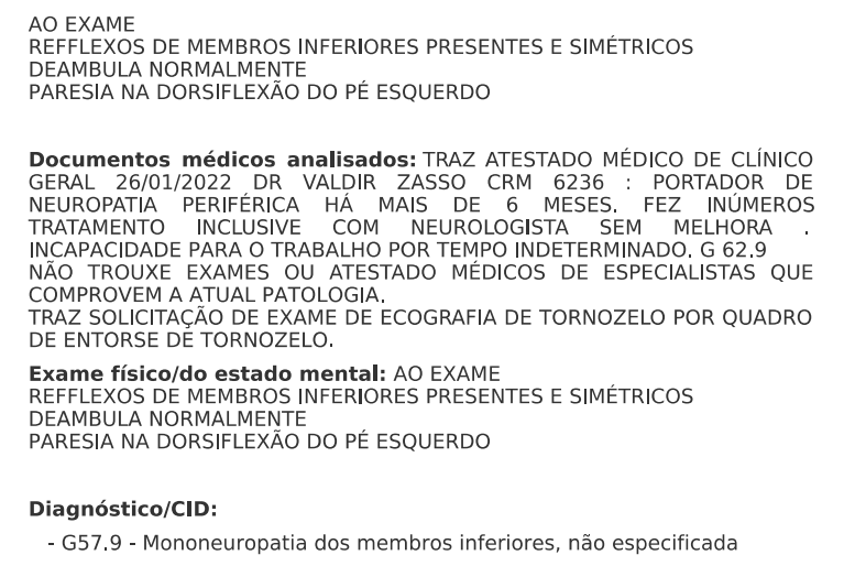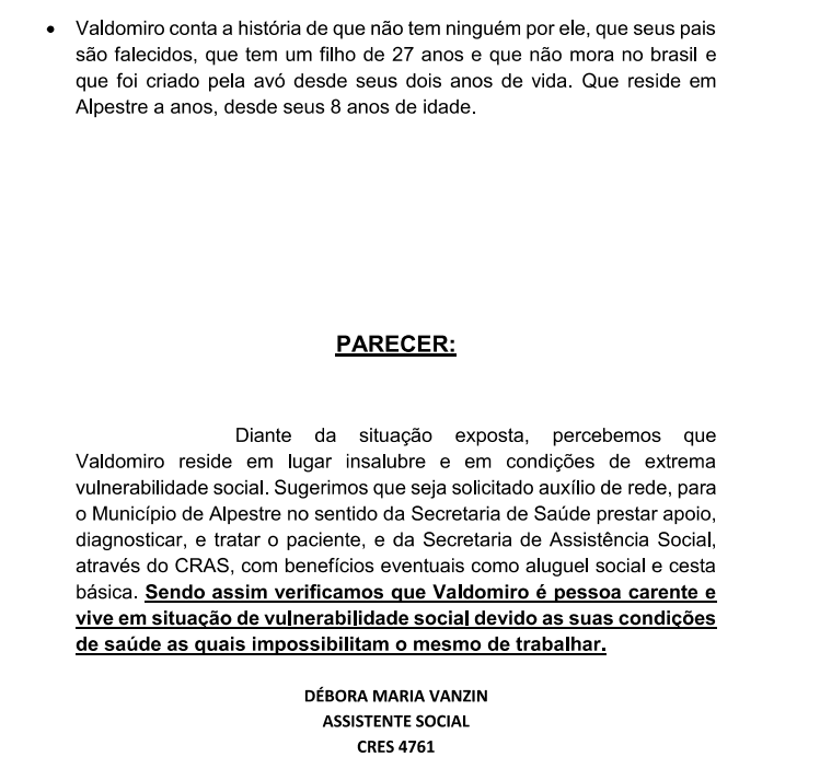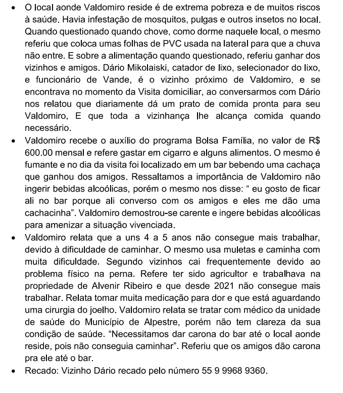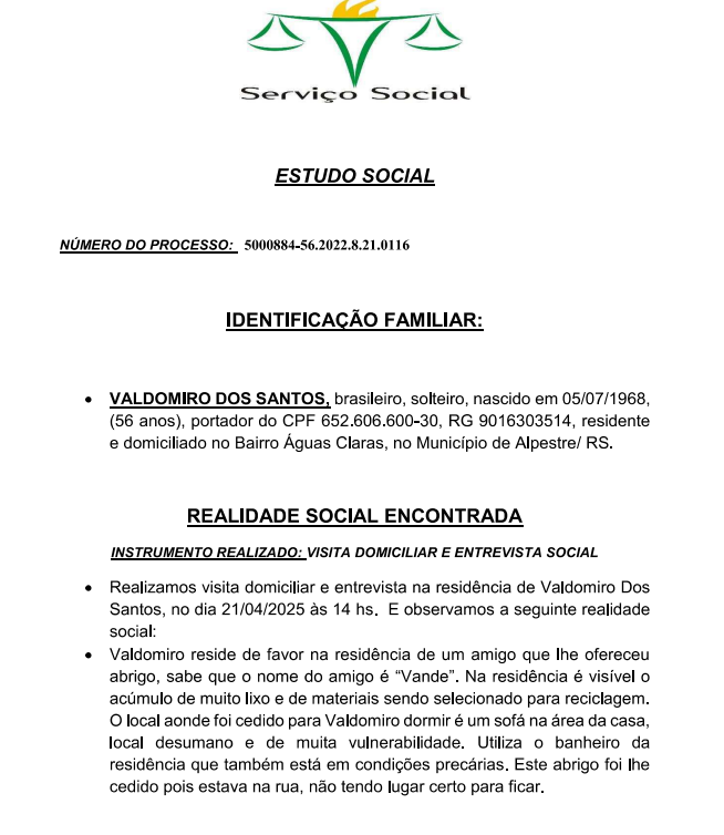 Segundo essas informações, o segurado está vivendo apenas com o valor mensal do bolsa família, reside de favor em local em más condições de conservação e higiene. No que diz respeito à saúde, é relatado que se trata de pessoa com grandes dificuldades de locomoção e quedas frequentes.