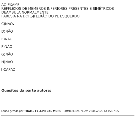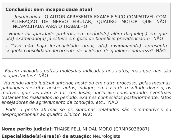 No que se refere à incapacidade, não obstante a apresentação de atestados médicos referindo a incapacidade laborativa, foi realizada perícia judicial, em 25/08/2023, cujo laudo foi assinado pela médica Thaise Fellini Dal Moro, com as seguintes conclusões (, págs 10/12 e , págs. 1 /2):
