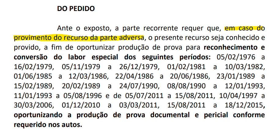 (iii) ao reconhecimento do exercício de atividade especial nos períodos de 05/02/1976 a 16/02/1979, 05/11/1979 a 26/12/1979, 01/02/1981 a 10/03/1982, 01/06/1985 a 12/03/1986, 22/04/1986 a 20/06/1986, 23/01/1989 a 15/02/1989, 20/02/1989 a 24/07/1990, 08/08/1990 a 12/01/1993 e de 11/01/1993 a 05/08/1996 e, subsidiariamente, seja dada a oportunidade à produção de prova pericial para o reconhecimento do tempo de serviço exercido sob condições especiais nos períodos de 05/02/1976 a 16/02/1979, 05/11/1979 a 26/12/1979, 01/02/1981 a 10/03/1982, 01/06/1985 a 12/03/1986, 22/04/1986 a 20/06/1986, 23/01/1989 a 15/02/1989, 20/02/1989 a 24/07/1990, 08/08/1990 a 12/01/1993, 11/01/1993 a 05/08/1996 e de 05/07/2011 a 15/08/2011, 10/04/1997 a 30/03/2006, 01/12/2010 a 03/03/2011 e de 15/08/2011 a 18/12/2015.
