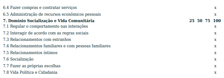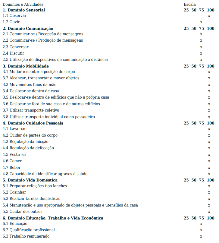 Para tanto, e sendo como exposto supra, necessária avaliação da deficiência e do seu grau, bem como fixar a data de início da incapacidade e o período em que se prestou labor naquele grau de deficiência, por meio de avaliação médica e funcional com pontuação dos elementos avaliados, obtém-se resultado que aponta se há deficiência e seu grau (leve, moderado ou grave). Em síntese, a pontuação total mínima é de 2.050, que corresponde à seguinte conta: 25 (pontuação mínima) multiplicado por 41 (número total de atividades em todos os domínios), vezes 2 (número de aplicadores). Já a pontuação total máxima é de 8.200, correspondente a 100 (pontuação máxima) multiplicado por 41 (número total de atividades em todos os domínios), vezes 2 (número de aplicadores).