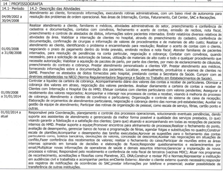Durante todo o período havia entre suas atribuições a necessidade de "atendimento ao cliente", com fornecimento de informações. Havia também o contato com médicos para fins de encaminhamento de documentações e orientações para preenchimento e conferência de cadastros.