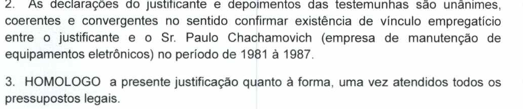 Portanto, o início de prova material (no caso, a comprovação de ajuizamento de reclamatória trabalhista), corroborada pela prova testemunhal, permitem afirmar que, de fato, o autor prestou serviço para o Sr. Paulo Chachamovich no lapso requerido - de 01/06/1981 a 04/01/1987.
