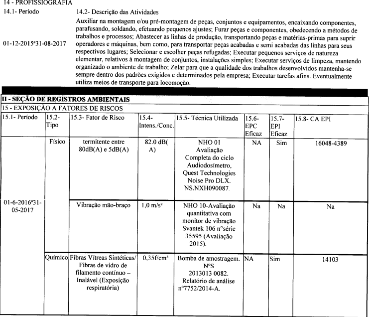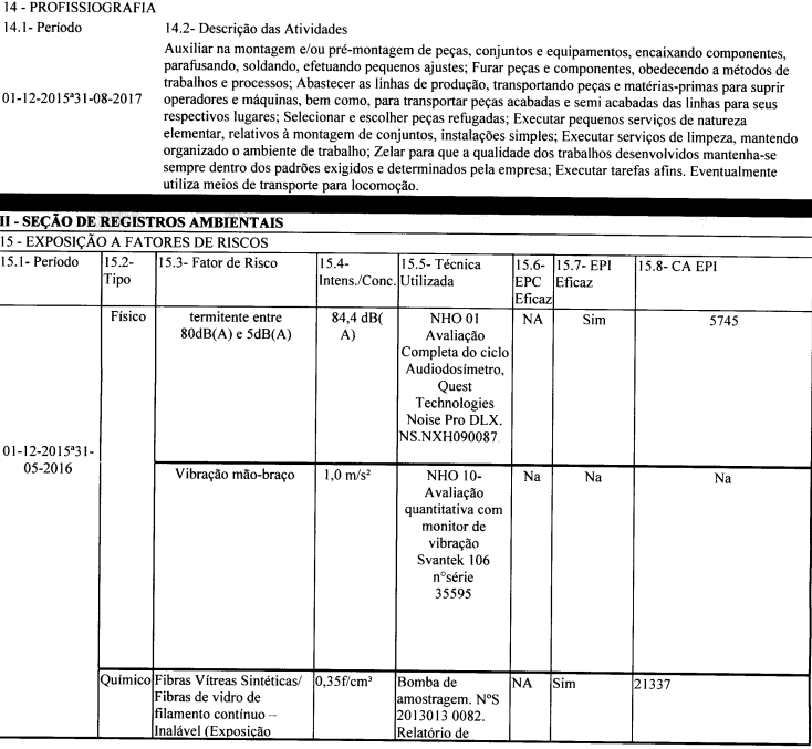 2017: Ruído de 88,6 dB, vibração mão e braço de 1,0 m/s², químicos (fibras vítreas sintéticas respiráveis) e poeira respirável;