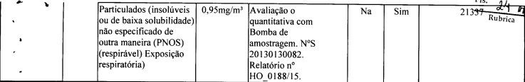 2015: Ruído de 84 dB, vibração mão e braço de 1,0 m/s², químicos (fibras vítreas sintéticas respiráveis) e poeira respirável;