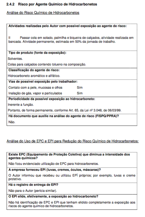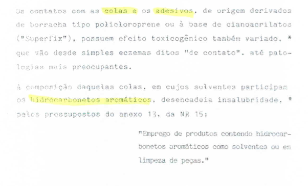 Tratando-se de indústria de calçados, indústria comum nas décadas de 80 e 90 no Estado de SC e RS, é de conhecimento público a utilização de cola no solado do calçado, ficando todo o setor de produção em contato habitual e permanente com esse agente químico. Setor de produção geralmente existente em um único galpão.