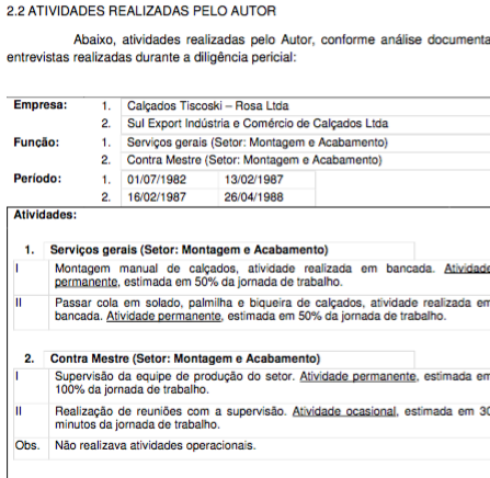 - Laudo pericial realizado em empresa integrante da indústria calçadista (inspeção realizada por semelhança na empresa Alto Astral Indústria de Calçados Ltda., nos autos 5006751-45.2015.4.04.7112), avaliando a função de serviços gerais e contra mestre no setor de montagem da empresa Calçados Tiscoski Rosa LTDA/Sul Export Indústria e Comércio de Calçados Ltda ():