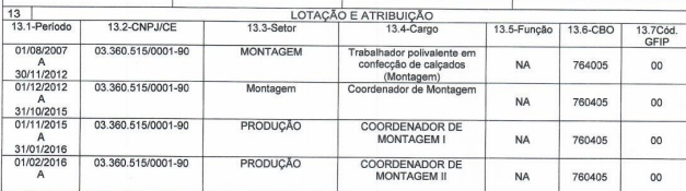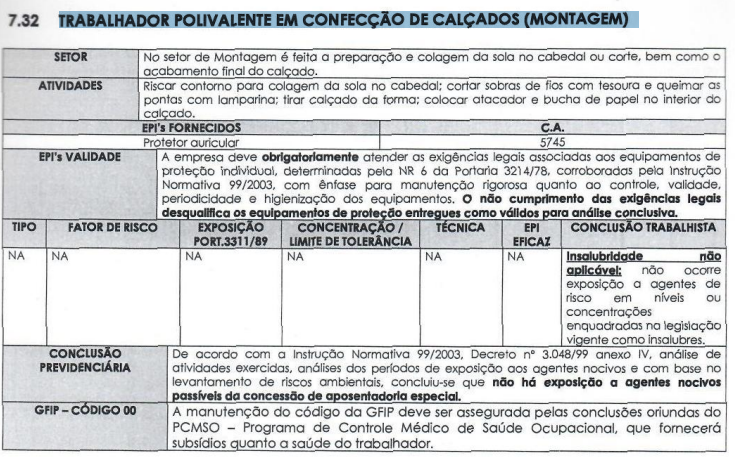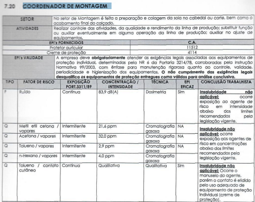 O PPP () registra o exercício de atividades nos setores de montagem e produção, nas funções de trabalhador polivalente na confecção de calçados (montagem) e coordenador de montagem.
