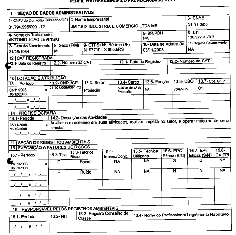 A sentença negou a especialidade para o período de 03/11/2008 a 16/12/2008 (JM Cris Indústria) porque o PPP não tinha indicação dos níveis de agentes nocivos. Negou também o período de 24/01/2011 a 27/11/2012 por ausência de formulário próprio para comprovação da especialidade: