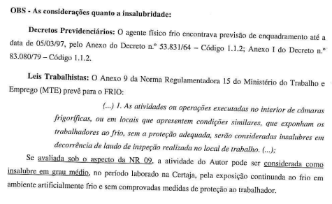 Nesse sentido, o laudo pericial foi deveras claro em relação ao local de trabalho do autor, constatando a insalubridade da atividade, decorrente da exposição ao frio, nos termos descrito às fls. 166/171 e, posteriormente, complementado no evento 14.