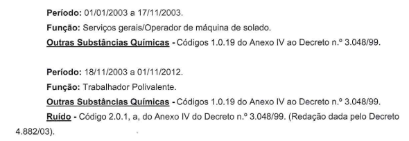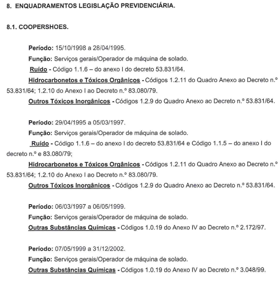 De acordo com a conclusão da perícia, o autor estava exposto de modo habitual e permanente a agentes nocivos à saúde, como ruído superior a 85dB, hidrocarbonetos e outras substâncias químicas, nos períodos de 15/10/1998 a 30/03/2017, quando laborou na indústria calçadista.
