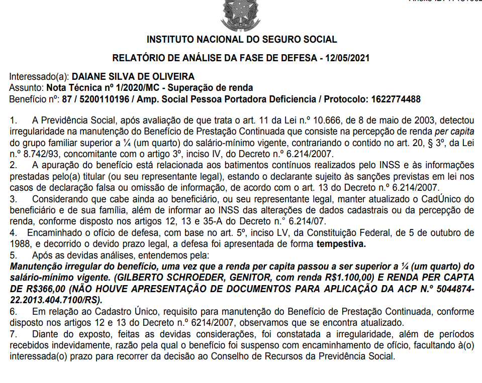A controvérsia cinge-se a manutenção da vulnerabilidade socioeconômica da parte autora, considerando que o benefício assistencial foi suspenso sob o argumento de “renda per capta superior a ¼ do salário mínimo vigente”, uma vez que o irmão da autora, que não faz mais parte do grupo familiar, passou a trabalhar com CTPS assinada, por determinado período., conforme nota técnica emitida pelo INSS acusando alteração do "status" econômico da família ():