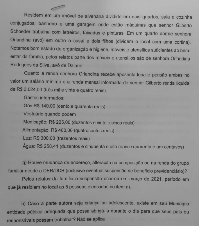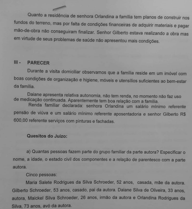 Deflui do laudo que o grupo familiar é composto pela autora, os genitores, o irmão Maickel e a avó. A renda da família deriva da pensão por morte e aposentadoria da avó, os salários mínimos auferidos pelo genitor e pelo irmão da autora. A casa é própria.