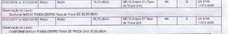 Agentes nocivos: ruído: de 01/11/2014 a 31/12/2015, 93,90 dB(A); de 01/01/2017 a 02/01/2018, 85,70 dB(A).