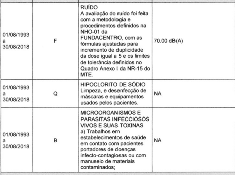Agentes nocivos: agentes biológicos (micro-organismos patogênicos) Enquadramento legal: Códigos 1.3.4 do Anexo I e 2.1.3 do Anexo II do Decreto 83.080/79, 3.0.1 do Anexo IV do Decreto nº 2.172/1997 e 3.0.1 do Anexo IV do Decreto nº 3.048/1999 |