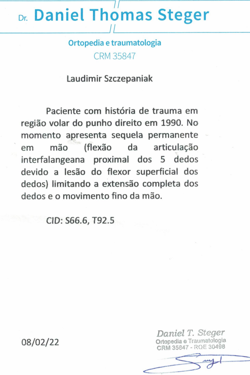 - Justificativa: Sequela funcional MODERADA em mão direita (dominante);