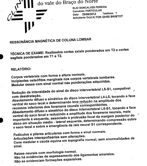 Respondendo aos quesitos formulados, o perito especialista em perícias médicas afirmou que os exames de imagem apresentados, datados de 30-08-2011 e 25-06-2012, revelaram alterações degenerativas da coluna vertebral. Disse que as receitas médicas relativas ao ano 2016, oriundas de consultas com clínico geral e cardiologista, não se observaram alterações que justificassem incapacidade laborativa. Do exame físico realizado na perícia, ressaltou que não foram observadas alterações que indiquem incapacidade laborativa atual, ou na data do requerimento, em 2012.