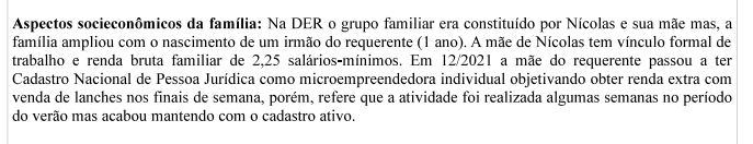 No que é pertinente à renda do núcleo familiar, apontou a assistente social () que o grupo é formado pelo autor, a mãe e dois irmãos menores (de 04 e 01 ano de idade). A renda provém unicamente dos vencimentos da mãe, que, conforme