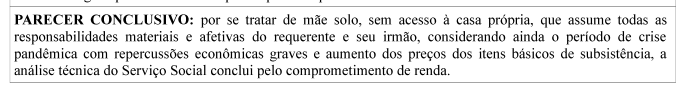 A lacônica conclusão apresentada pela autarquia leva a crer que a motivação utilizada para negar o benefício é nula, pois contrária aos motivos externados no laudo social antes mencionado. Isso porque, "de acordo com a teoria dos motivos determinantes, a razão exarada para fundamentar a prática de determinado ato administrativo deve sempre guardar compatibilidade com a situação de fato que gerou a manifestação da vontade. O administrador está vinculado ao motivo exarado na sua decisão, mesmo quando não está obrigado a fazê-lo" (REsp n. 1.229.501/SP, relator Ministro OG FERNANDES, SEGUNDA TURMA, DJe de 15/12/2016)