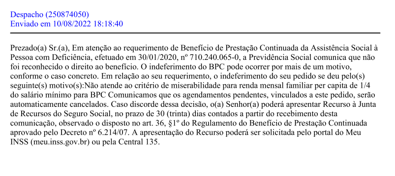 | Espécie | Benefício Assistencial Pessoa com Deficiência |