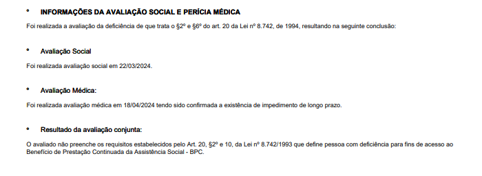 Veja-se que no mesmo documento constou, no item seguinte ()Resultado da avaliação conjunta), que não ocorreu a conceituação de "deficiência para fins de acesso ao benefício (...)".