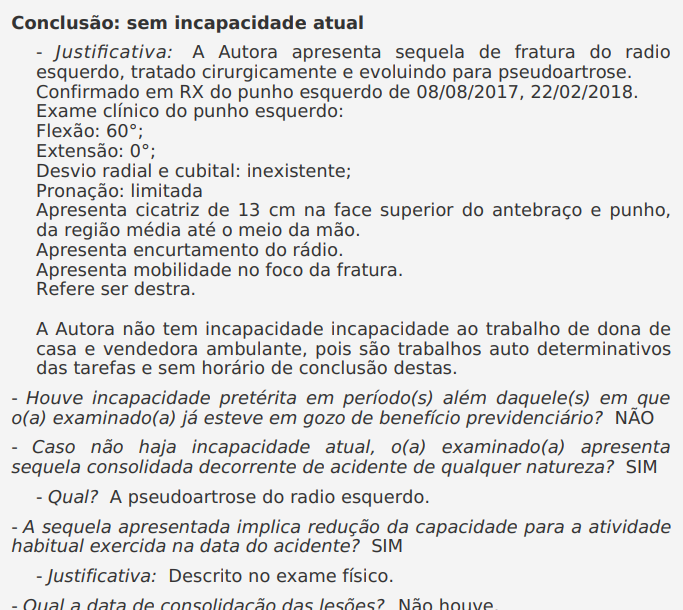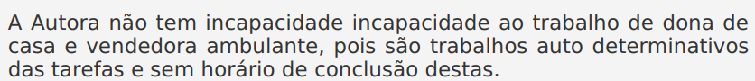 Ressalta-se que o perito judicial concluiu pela ausência de incapacidade laboral da parte autora em virtude da natureza das atividades que esta exerce, quais sejam, dona de casa e vendedora ambulante, argumentando que tais atividades, em tese, não possuem um horário de conclusão definido, conforme segue: