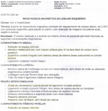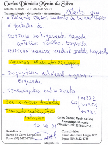 PMC : segurdao refere que trabalha consertando geladeiras , refere dor em ombro D e joelho E. Refere que está aguardando cirurgia em joelho E. Informa estar em uso de maxsulid e ibupreofeno. Traz atestado médico crm 8527 de 19/09/2018 "...M75.1/M75.4/M23.2/M17.1." US de ombro D de 17/01/2018 CRM 7884 " Espessamento do supraespinhoso e infraespinhoso.. Achados ecograficos compativeis com síndrome do impacto grau I...". Traz RNM de joelho E de 05/12/2017 CRM 24558 " Redução do compartimento articular medial, menisco medial protuso, com ruptura obliqua...Sinais de estiramento/ruptura parcial de LCA... Redução do espçao articular femoropatelar...."