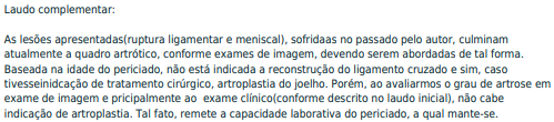 As lesões apresentadas(ruptura ligamentar e meniscal), sofridaas no passado pelo autor, culminam atualmente a quadro artrótico, conforme exames de imagem, devendo serem abordadas de tal forma. Baseada na idade do periciado, não está indicada a reconstrução do ligamento cruzado e sim, caso tivesseinidcação de tratamento cirúrgico, artroplastia do joelho. Porém, ao avaliarmos o grau de artrose em exame de imagem e pricipalmente ao exame clínico(conforme descrito no laudo inicial), não cabe indicação de artroplastia. Tal fato, remete a capacidade laborativa do periciado, a qual mante-se.