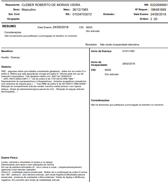 Cumpre registrar que a perícia administrativa examinou o demandante em 24/09/2018, e, embora não tenha reconhecido a incapacidade laboral, constatou a existência da moléstia "Dor articular", bem como apontou que o segurado, que "trabalha consertando geladeiras", queixou-se de "dor em ombro D e joelho E. Refere que está aguardando cirurgia em joelho E" (, fl. 41):