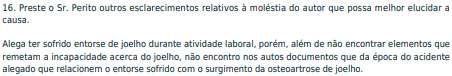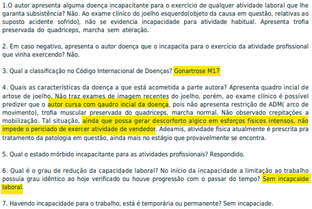 O diagnóstico foi de gonartrose [artrose do joelho] (CID M17). Contudo, à avaliação física, como se vê, não foram constatadas quaisquer alterações em relação à mobilidade do autor, considerando-se que todos os testes e manobras efetuados pelo perito judicial foram negativos. Dessa maneira, o profissional nomeado pelo MM. Juiz concluiu não haver incapacidade, considerando suas atividades laborativas habituais, como se extrai, também, das respostas aos quesitos do ora recorrente (grifei):