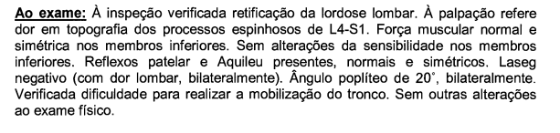 Em inspeção, o perito verificou retificação de lordose lombar. À palpação refere dor em topografia dos processos espinhosos de L4-S1. Força muscular normal e simétrica nos membros inferiores. Verificada dificuldade para realizar a mobilização do tronco. Sem outras alterações físico.