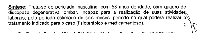 Em síntese, refere tratar-se de periciado masculino, com 53 anos de idade, com quadro de discopatia degenerativa lombar. Incapaz para a realização de suas atividades laborais, pelo período estimado de seis meses, período no qual poderá realizar o tratamento apropriado para o caso (fisioterápico e medicamentoso).