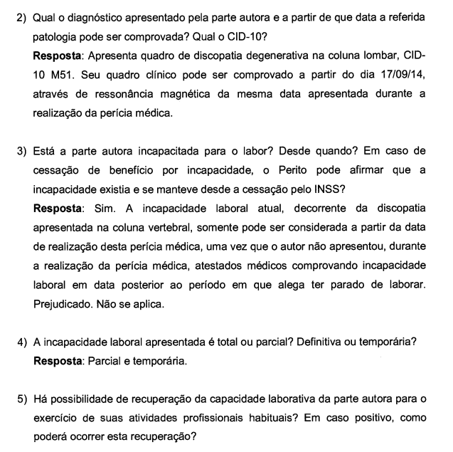 Ao responder o 2º quesito, indica que Vilmar apresenta quadro de discopatia degenerativa na coluna lombar, CID10 M51. Seu quadro clínico pode ser comprovado a partir do dia 17.09.2014, através de ressonância magnética da mesma data apresentada durante a realização da perícia médica. Já no 3º quesito informa que a incapacidade laboral pode ser considerada a partir da perícia médica, uma vez que o autor não acostou nenhum atestado médico comprovando a incapacidade em data posterior ao que alega ter parado de laborar.