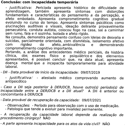 O diagnóstico foi de esquizofrenia não especificada (CID F 20.9) e retardo mental leve (CID 7.0), tendo a expert concluindo que a autora apresenta incapacidade total e temporária para o trabalho, remontando a incapacidade a 09/07/2019: