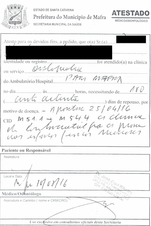 A corroborar o alegado quadro clínico, bem como sua manutenção afora dos períodos de cobertura de benefício por incapacidade, foram anexados atestados médicos, datados de 25-04-2016, 13-09-2017 e 10-06-2023, nos quais é afirmado que a parte autora encontra-se acometida por moléstias incapacitantes de CID 10 M51.1 e M54.4 (e. , p. 1; , p. 1 e , p. 6).