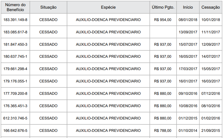 No caso, a parte autora recebeu os seguintes benefícios por incapacidade (e. ):