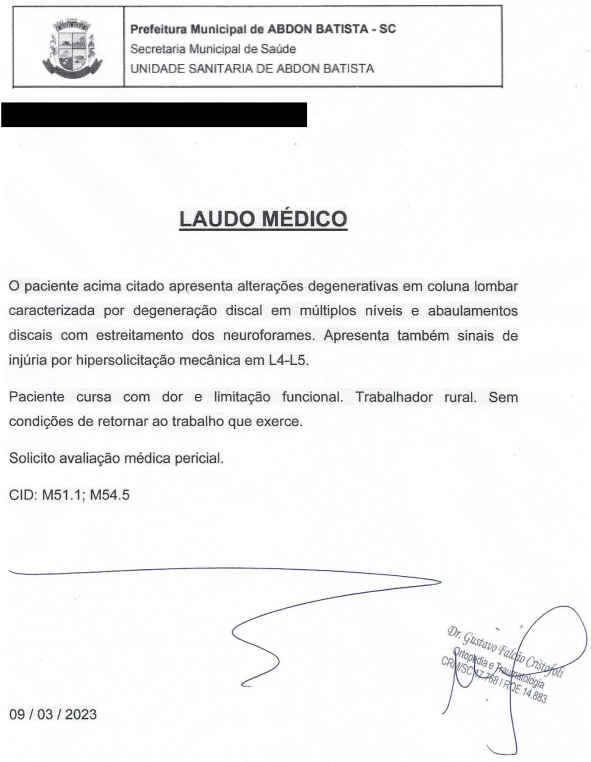 A parte autora (agricultor e 58 anos de idade atualmente) objetiva a concessão de benefício por incapacidade desde 16-03-2023 (DER do NB 643.553.121-1), em decorrência de problemas na coluna lombar (CID 10 M51.1 e M54.4), comprovadas pela seguinte documentação clínica: