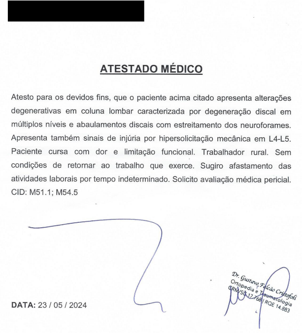 Documentos médicos analisados: Atestado ortopedista 23/05/24: lombociatalgia.