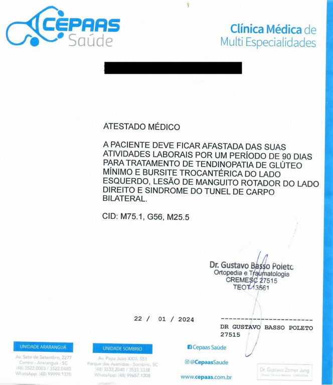 - Observações: Recomenda-se 9 meses de afastamento laboral a contar da data de início da incapacidade (DII).