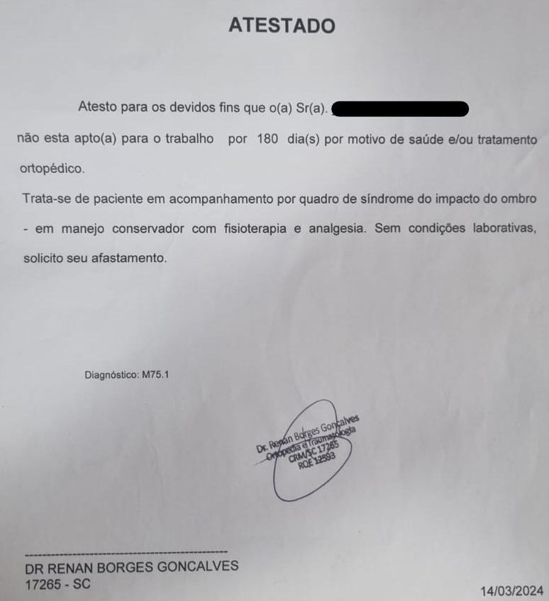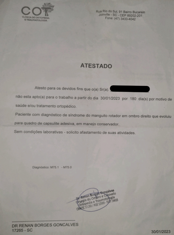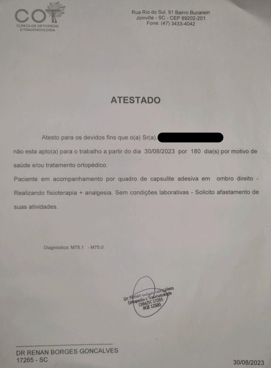 A corroborar o alegado quadro clínico, os atestados médicos supracitados, emitidos em 30-01-2023, 30-08-2023 e 14-03-2024 (e. , pp. 39 e 42; ), evidenciam que a incapacidade laboral, em decorrência de síndrome do manguito rotador, é mantida desde a cessação do NB 626.518.272-6 (31-01-2023).